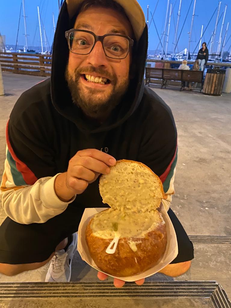 En restaurantes de la zona podremos disfrutar el Dungeness crab, un tipo de cangrejo, especialidad de las casas de la zona, y la sopa de almejas en cuencos de pan de masa madre (que como podéis ver Mario degusto sentado en un escalón de madera del muelle con una cerve fresquita). Tenéis que probarla si o si. Hay bastantes sitios donde hacerlo, pero nos decantamos por el Pier Market Seafood, que era el mejor valorado de todo el muelle, y tienes la opción de entrar al restaurante o pedirlo en un puestito que tienen al lado, en el que lo preparan rápidamente y os quitareis una buena cola de encima.