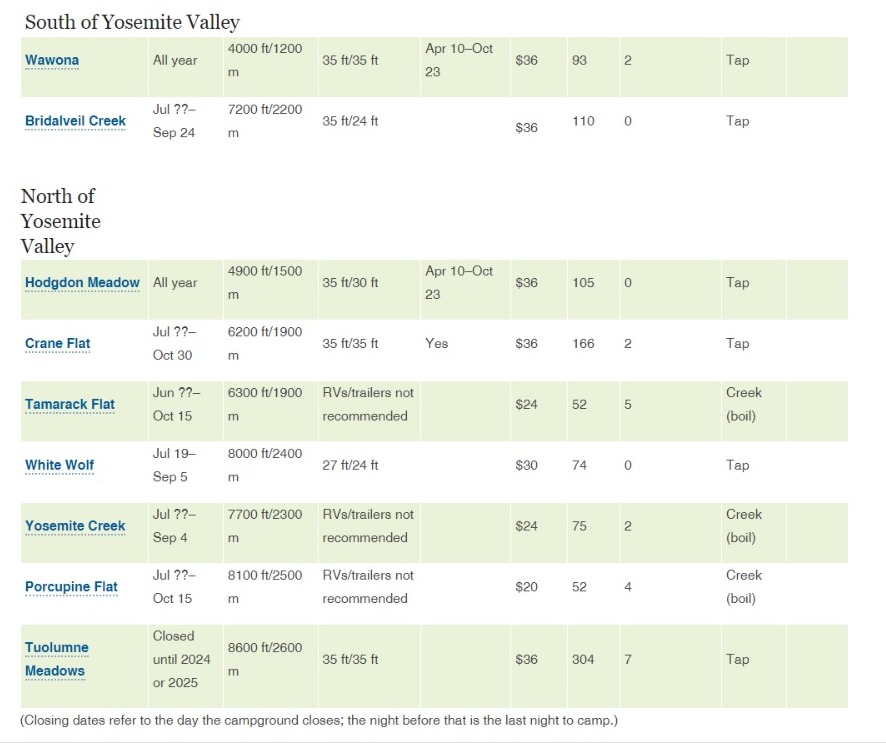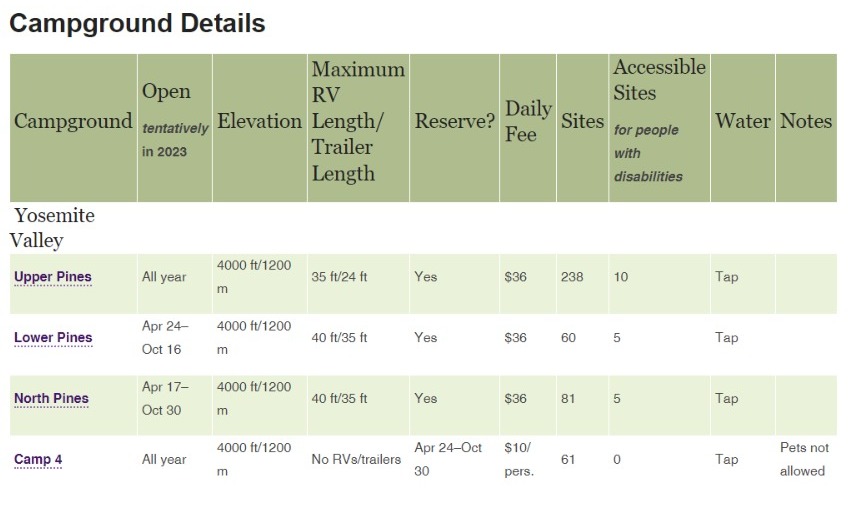 Por otro lado, hay dos campings que tiene un modo de reserva diferente al resto: North Pines y Camp 4.