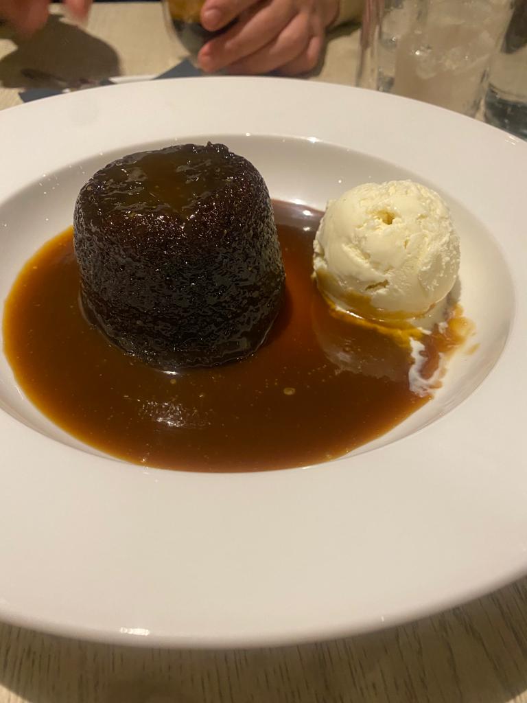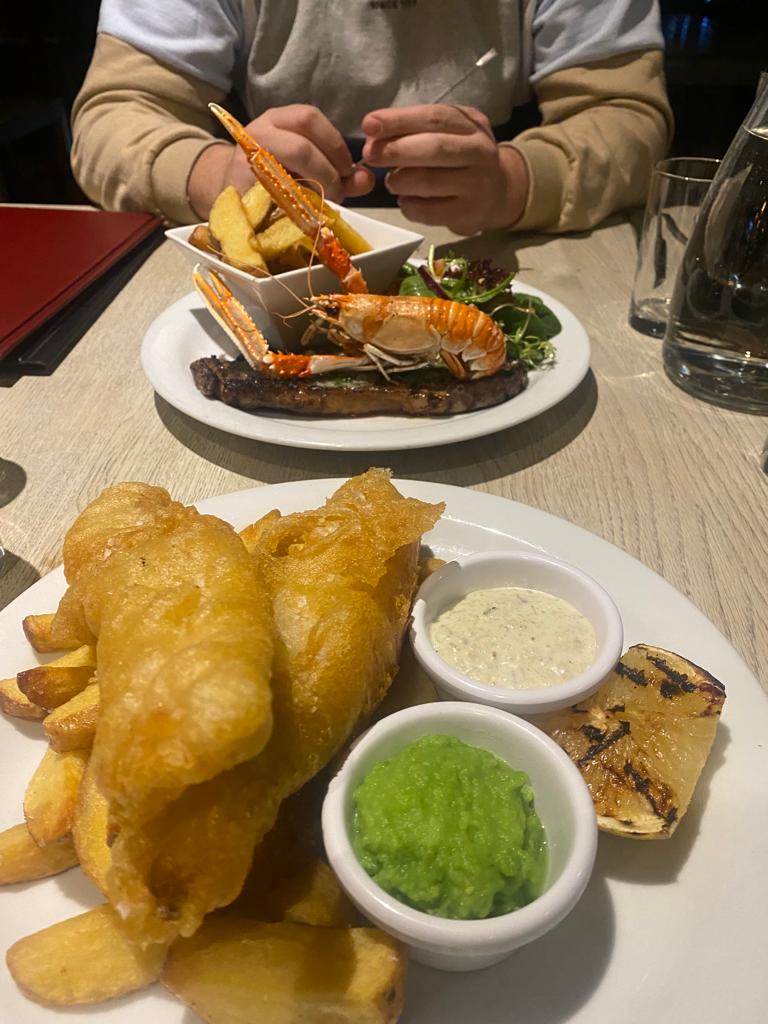 Después de visitar Oban volvimos a nuestro alojamiento a disfrutar de la última cena del 2022 y celebrar el Hogmanay. De primero tomamos la sopa del día y una sopa de mejillones (SHETLAND MUSSEL CHOWDER), seguimos con un Fish and Chips (el pescado estaba ahumado y es sin duda el más rico que probamos) y un solomillo con langostinos (SURF & TURF) y de postre obviamente el Sticky Toffee Pugding.