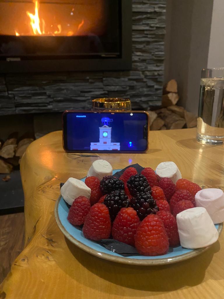 Después de la comilona, nos sentamos en el salón común donde mucha gente del pueblo venia a tomarse un whisky antes de la media noche. La verdad que el ambiente era super agradable con la chimenea y los sofás de piel mientras veíamos la nieve caer en el lago. Fueron tan amables que después de contarles que en España comíamos uvas a media noche nos prepararon un platito de frambuesas para hacer la cuenta atrás.