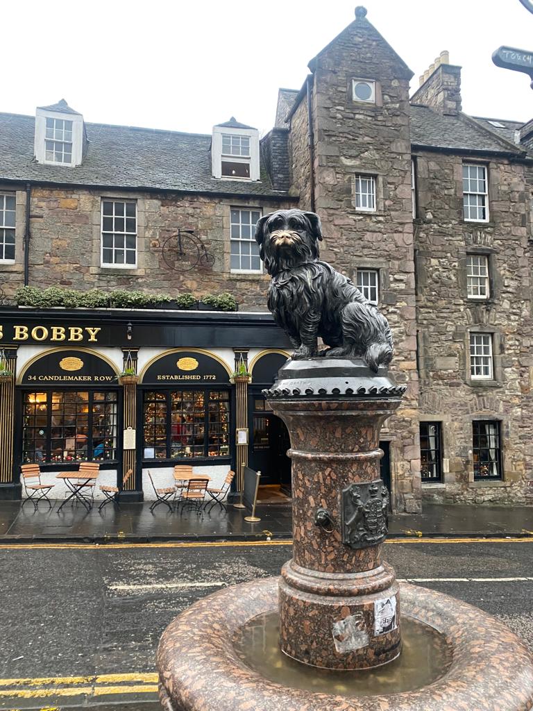 Bobby era el perro de John Gray un vigilante nocturno que murió de tuberculosis en 1858, tras su muerte fue enterrado en el cementerio de Greyfriar y cuenta la leyenda que Bobby permaneció junto a la tumba de su dueño durante 14 años. Cuando falleció fue enterrado en el mismo cementerio, siendo el único animal enterrado en Greyfriar. Es tan famoso que tiene una estatua (no le toquéis la naricilla por favor) y un pub con su nombre.