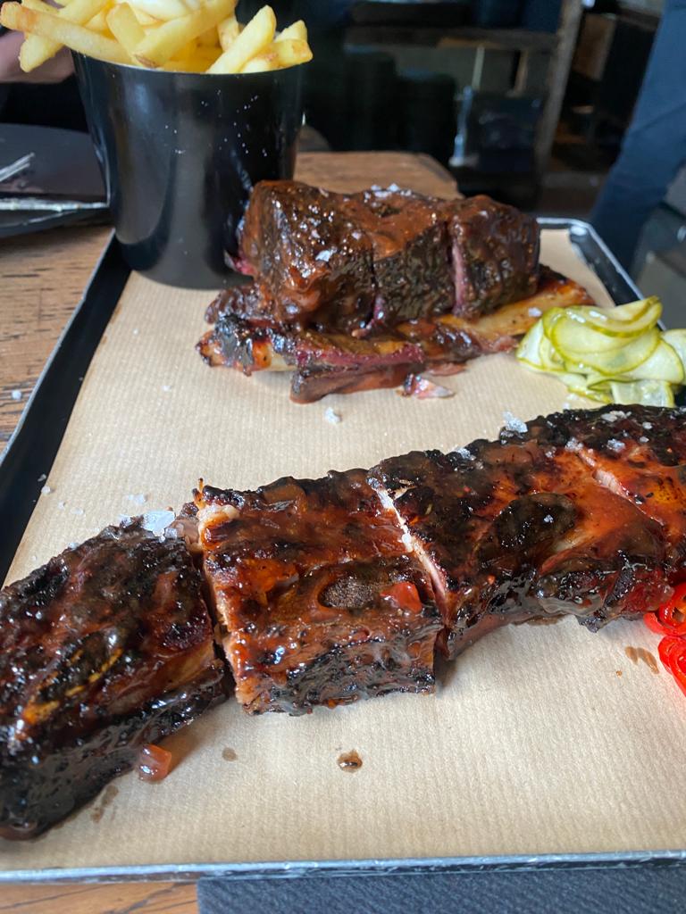 Otro punto chulo del barrio es el Beigel Bake Brick Lane Bakery un local de beigel de toda la vida super popular que suele tener una colas larguísimas, pero suponemos que valdrá la pena. Como nosotros íbamos justo de tiempo decidimos ir a un restaurante muy chulo del que habíamos leído muy buena reseñas: SMOKESTAK. Este local esta especializado en carne ahumada y a la parrilla. La carne estaba deliciosa y el trato de los camareros fue espectacular.