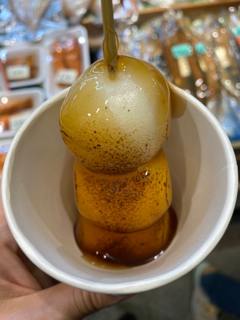 - Dango. Es una brocheta de bolita glutinosas parecidas a los mochis que se pasan por la plancha y se bañan en una salsa de soja dulce y densa. Nosotros comimos una brocheta de dango en el Nishiki Market.
