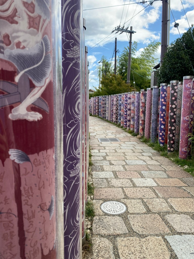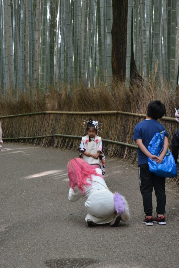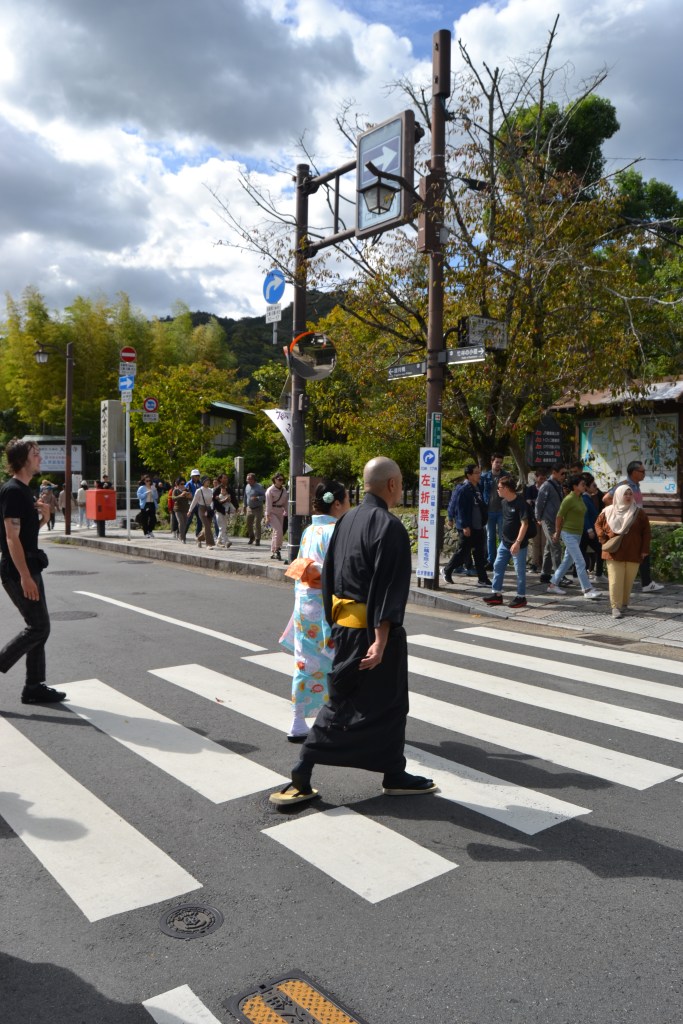 Una vez visitado el templo Tenryu-ji os topareis de frente con la calle principal de Arashiyama. Está arteria principal está repleta de restaurantes, cafeterías y tiendas, nosotros tardamos literalmente 1 hora para hacer escasos metros. Además, aquí podéis ver el Kimono Forest, un pequeño jardín con decenas de tubos enormes que muestran diferentes tejidos de kimono pintados a mano, mola mucho especialmente de noche cuando los tubos se retro iluminan. Esta ubicado junto a la estación de tren de Arashiyama Station.