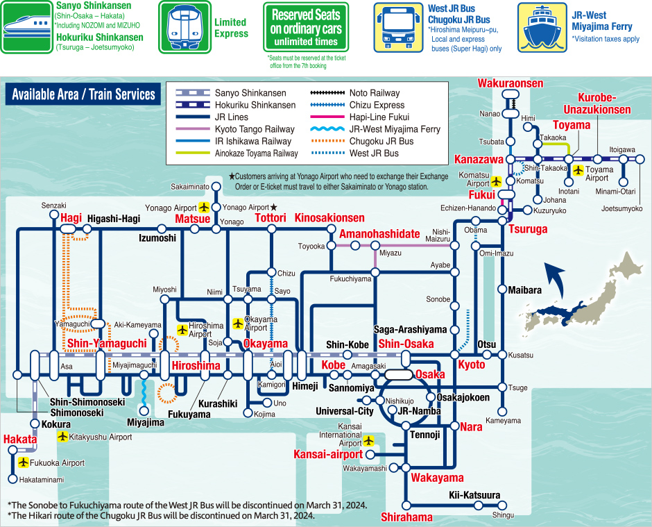 Además, el JR Pass se puede utilizar en el Tokyo Monorail, la línea Yamanote de Tokio, la línea entre Aomori y Hachinohe, la línea Ainokaze Toyama entre Toyama and Takaoka, el Narita Express del aeropuerto de Narita Airport a Tokio y la línea IR Ishikawa Railway entre Kanazawa y Tsubata.