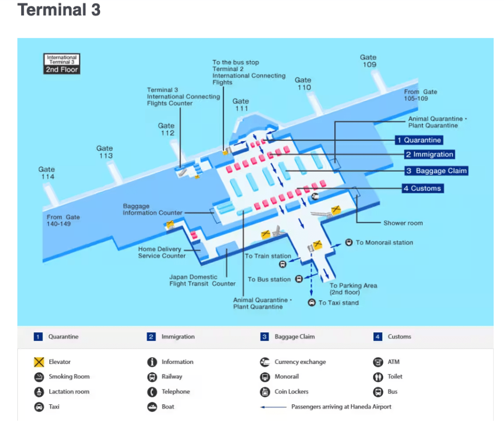El aeropuerto de Haneda o aeropuerto Internacional de Tokio, es una de las puertas principales de entrada al país nipón. Tiene 3 terminales y la T1 y la T2 están conectadas por un pasillo subterráneo y el típico bus gratuito que conecta las tres terminales.