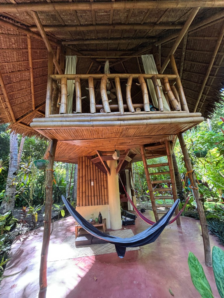 - Water to Forest Ecolodge. Fue nuestro alojamiento para los días que nos hospedamos en Bohol y fue todo un acierto. Nada más llegar, tras atravesar un camino al margen del río Loboc, nos enamoramos completamente. Las habitaciones consisten en cabañas de bambú abiertas que tienen el baño con ducha privada (pero sin agua caliente) y la cama en la parte superior acondicionada con mosquitera y ventilador. Cada cabaña tiene sus tumbonas y una pequeña zona de patio privada. Al estar tan apartado de todo, por la noche solo escucharás el ruido de los animales que viven cera del río. El hotel cuenta con servicio de restaurante, alquiler de motos, paddle surf, etc.