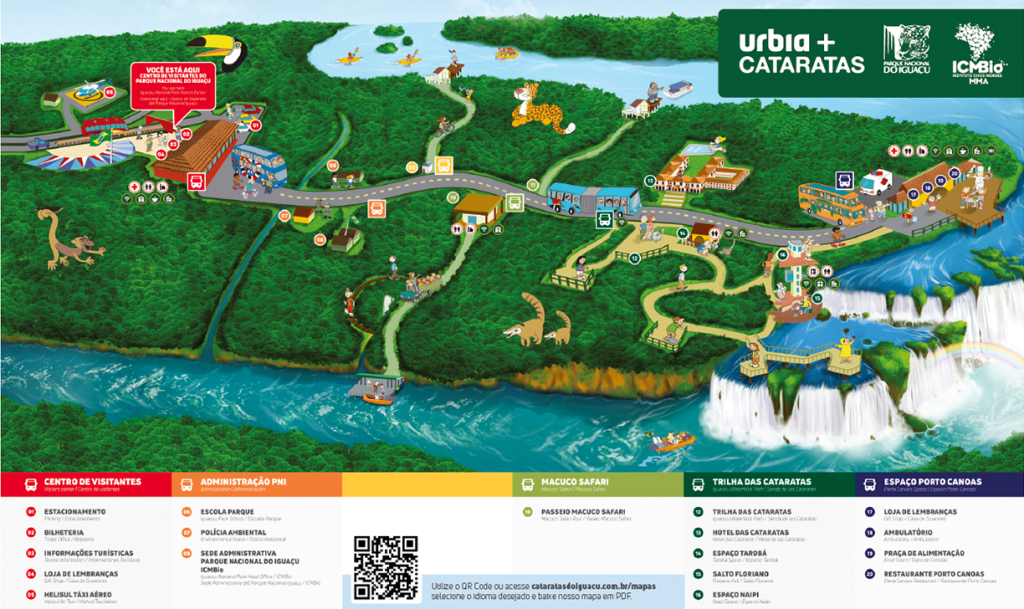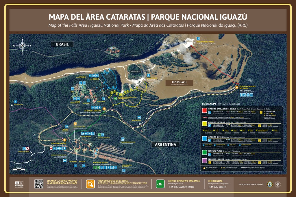 Podéis pagar en efectivo o con tarjeta, por si no queréis cambiar a reales brasileños. La entrada incluye el autobús que recorre el interior del parque, en el mapa podéis ver las paradas, Trilhas das Cataratas os dejara justo al pie del sendero principal del que os hablamos a continuación.