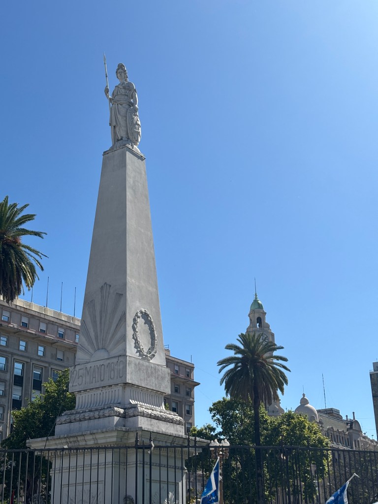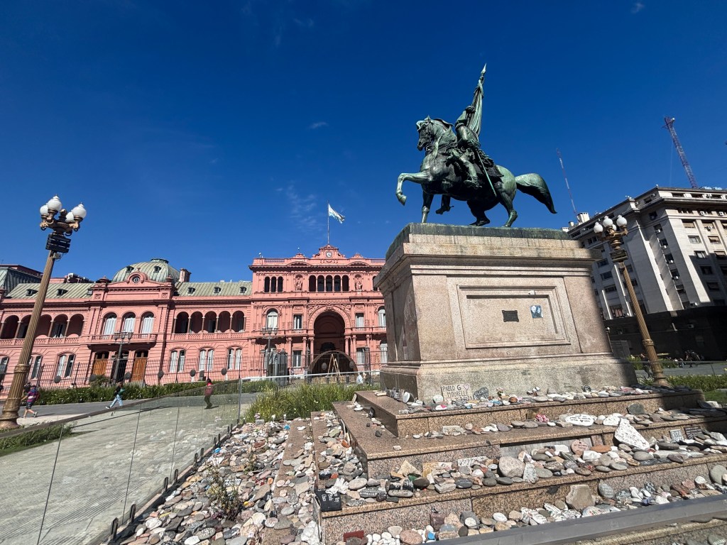 Justo enfrente de la fachada de la casa Rosada se encuentra la estatua ecuestre del general Manuel Belgrano uno de los políticos más destacados en el proceso de la Independencia nacional. La estatua ondea la bandera, ya que es a este mismo general el que se le atribuye la creación de la bandera de Argentina en la ciudad de Rosario. A los pies de la estatua (al menos cuando nosotros la visitamos, en 2024) había infinidad de pequeñas piedras colocadas para rendir homenaje a las víctimas de la pandemia del COVID-19.