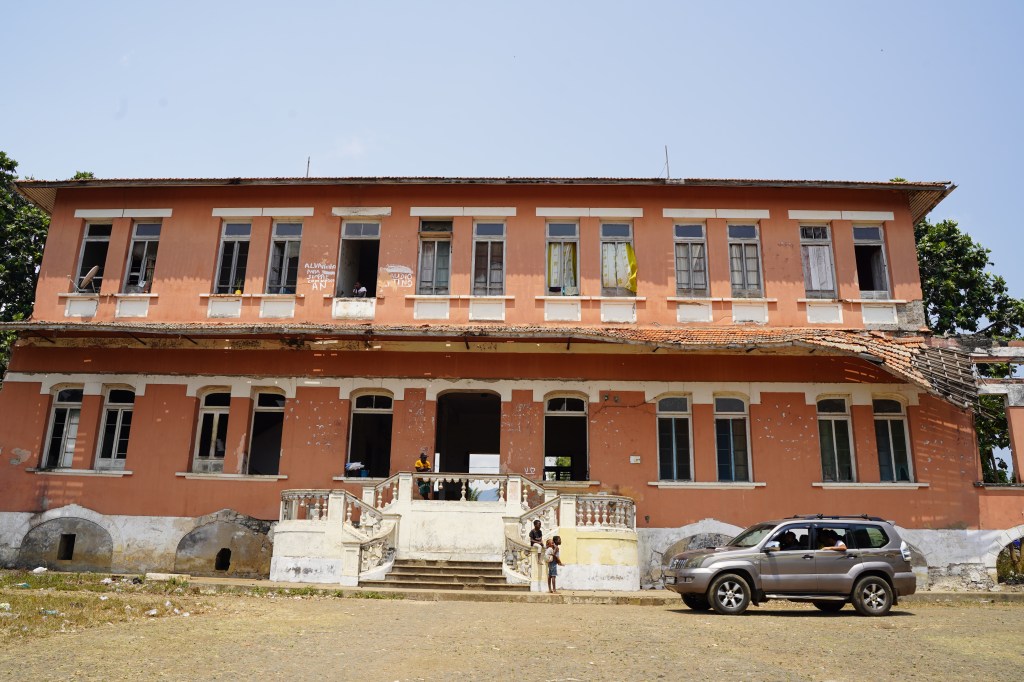El edificio más importante de la Roça es el antiguo hospital en el que durante la década de los 80 nacieron cientos de santotomeses. Ahora mismo está prácticamente en ruinas, pero su fachada principal sigue siendo impresionante.