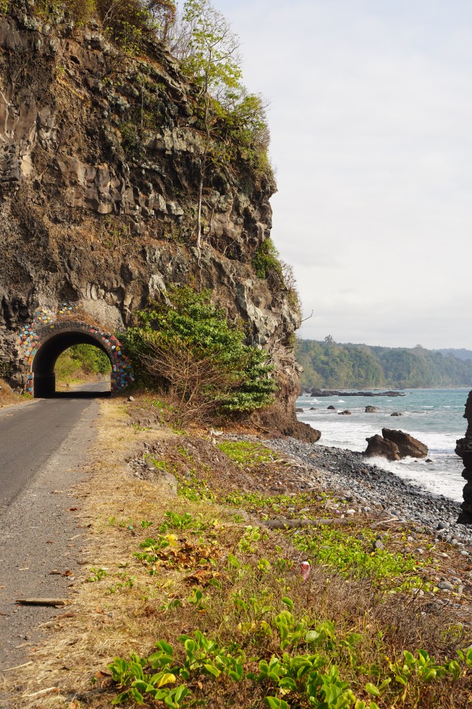 La carretera que la isla termina muy cerca de este punto en el norte de San Tomé, a partir de aquí se extiende por la costa la selva virgen del Parque de Obô. Al final de carretera hay una postal muy característica de Sao Tomé, un túnel que cruza la carretera al lado del mar y rodeado de palmeras. Vale la pena hacer alguna foto chula y pensar en lo salvaje e inescrutable del otro lado, metafóricamente hablando claro.